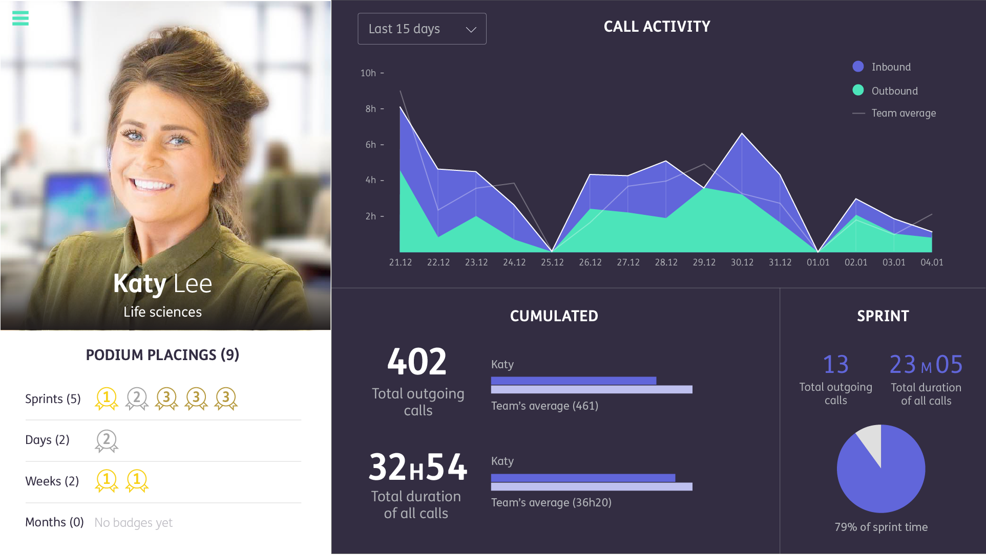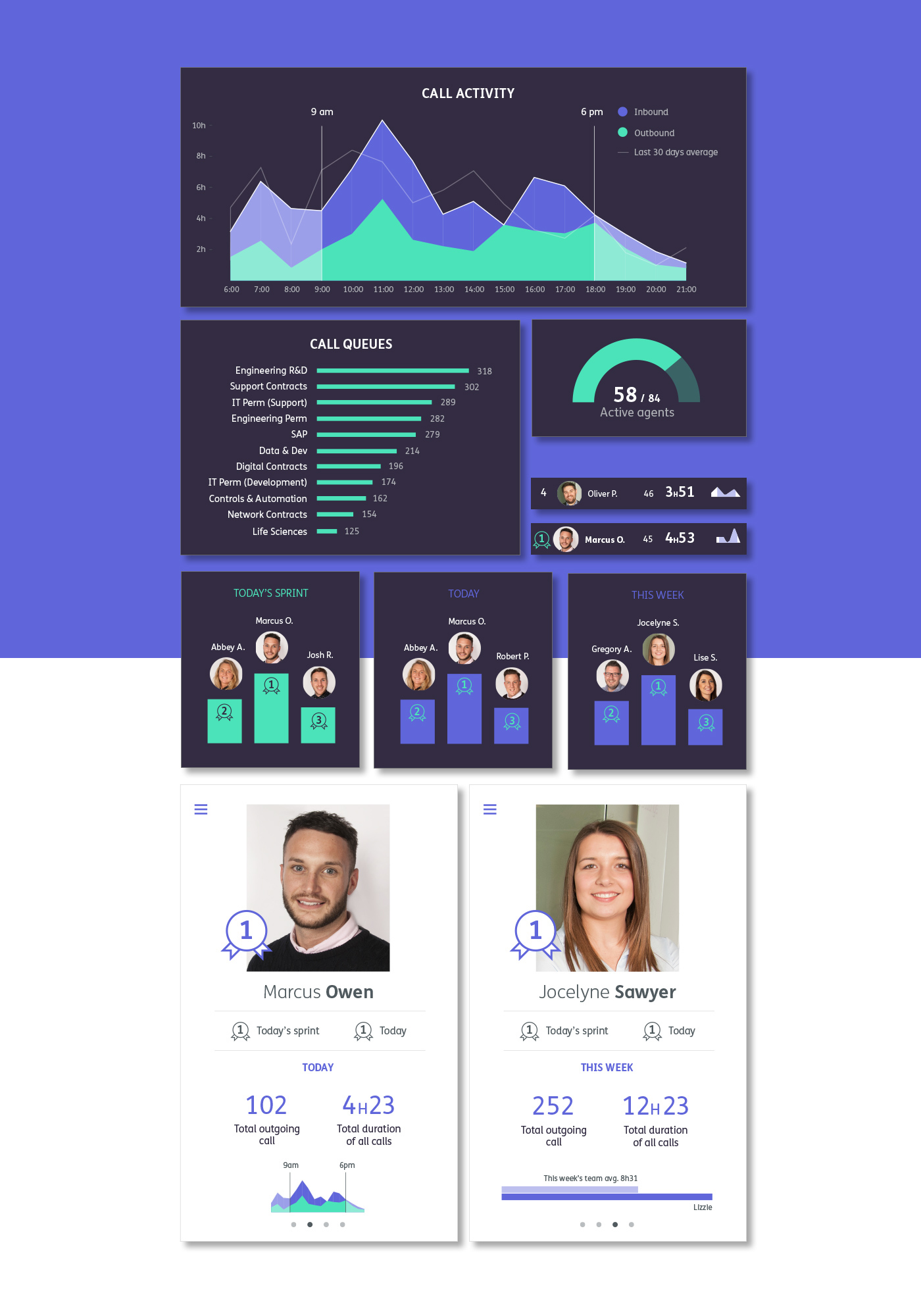 The layout is split into distinct sections displaying relevant information regarding the call activity. Consultants are awarded with badges according to their performances.