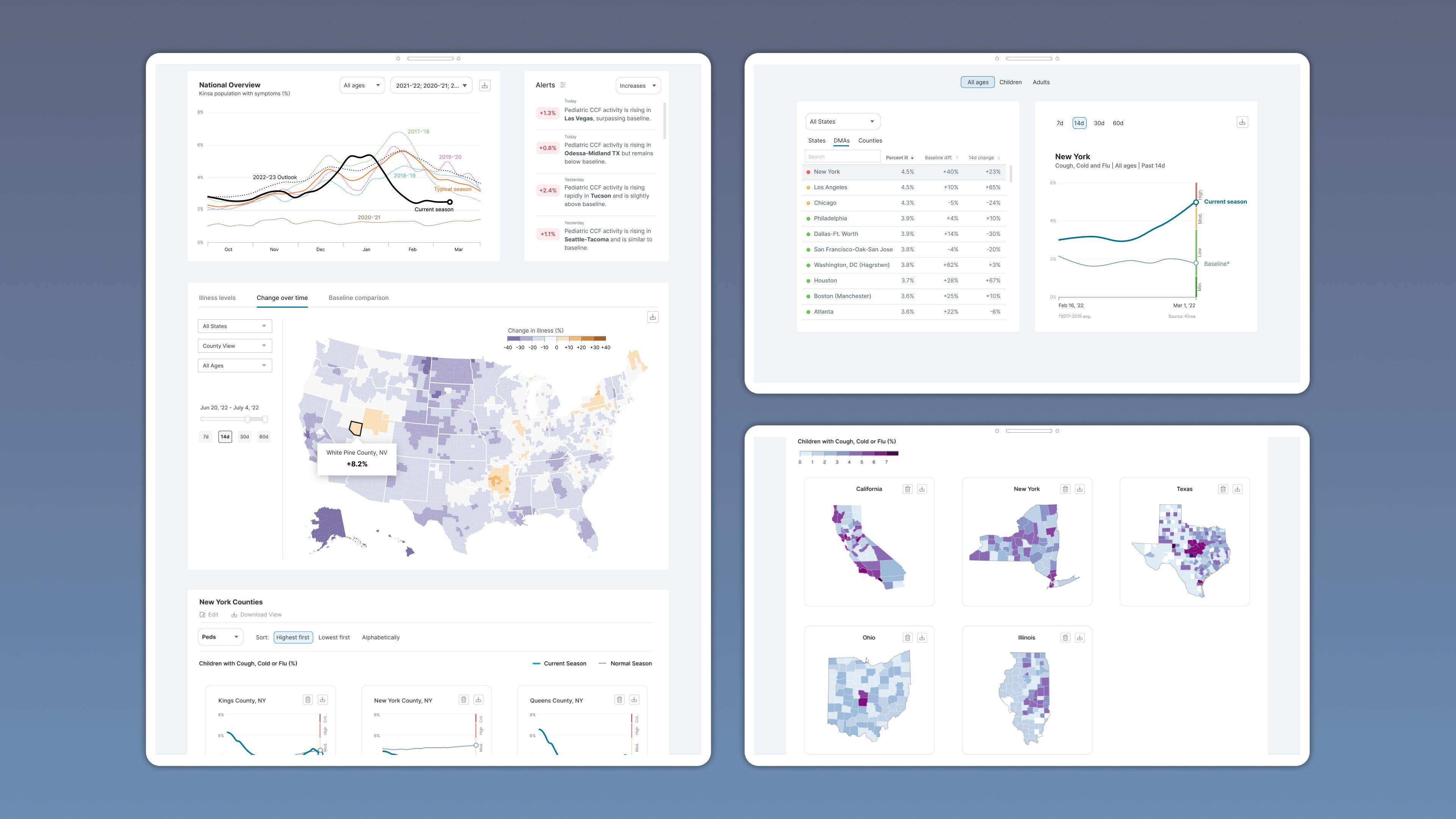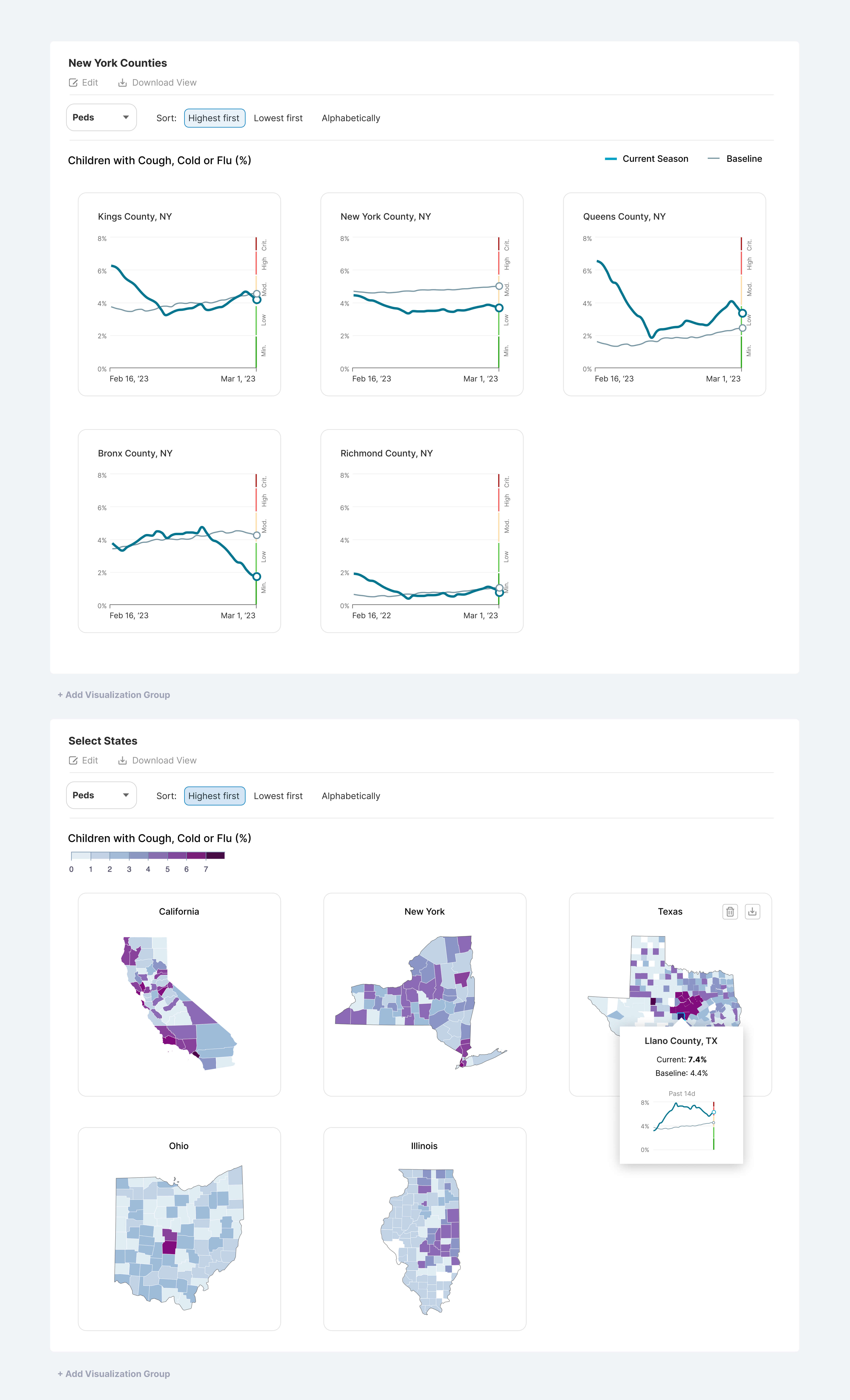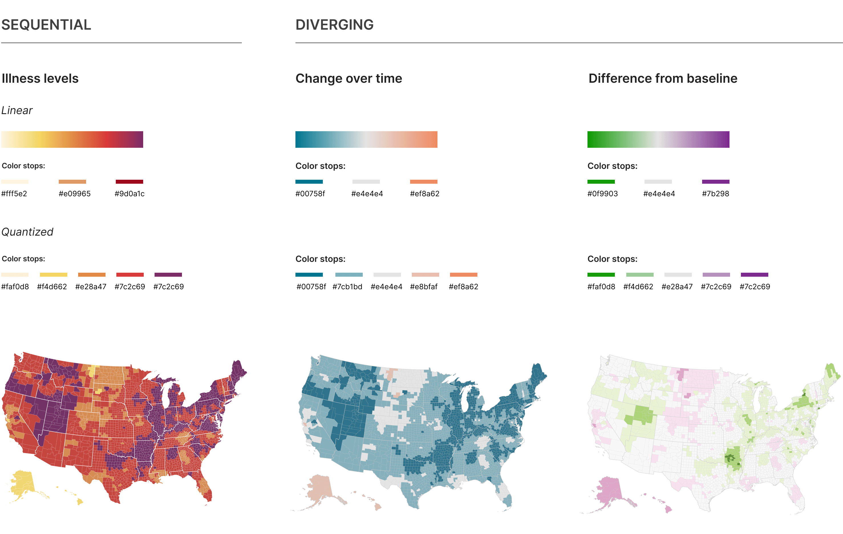 To optimize the user experience, I differentiated the map scale based on the type of insight. The color palettes were tailored for three types of data analysis: current illness levels, changes over time, and deviations from a baseline. This distinction enables users to quickly identify the type of insight they are viewing.