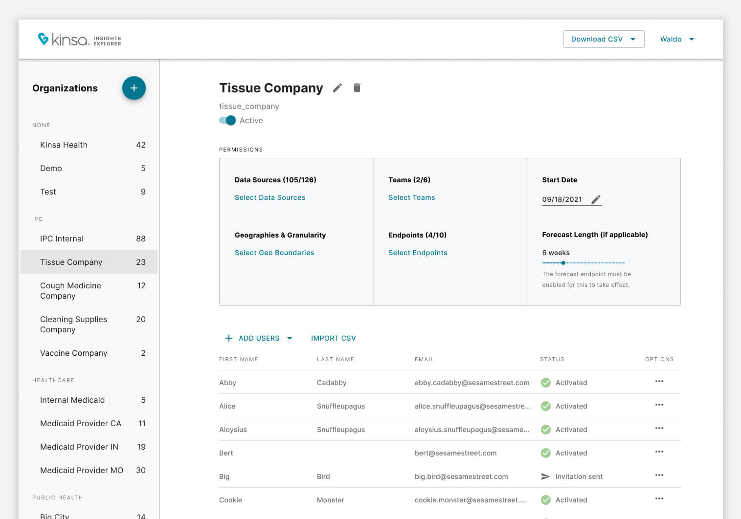 Internal admin users needed the ability to create companies, add users to them, and manage their data permissions (i.e. geographic areas, signals, age groups, etc.). To do so, we designed and developed an admin panel from scratch, using Material UI.