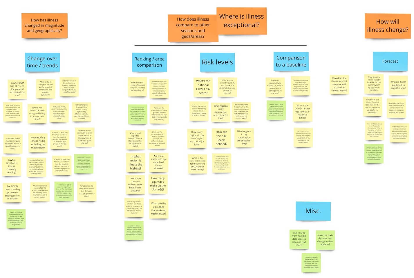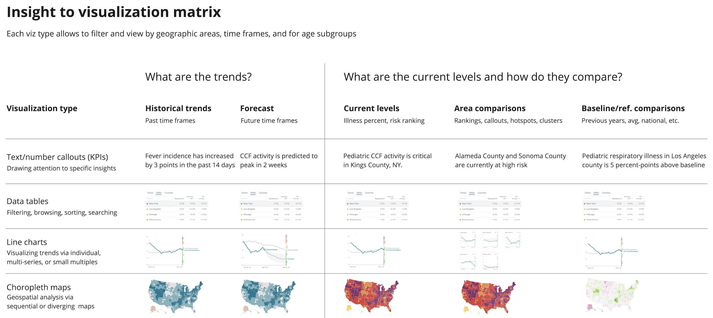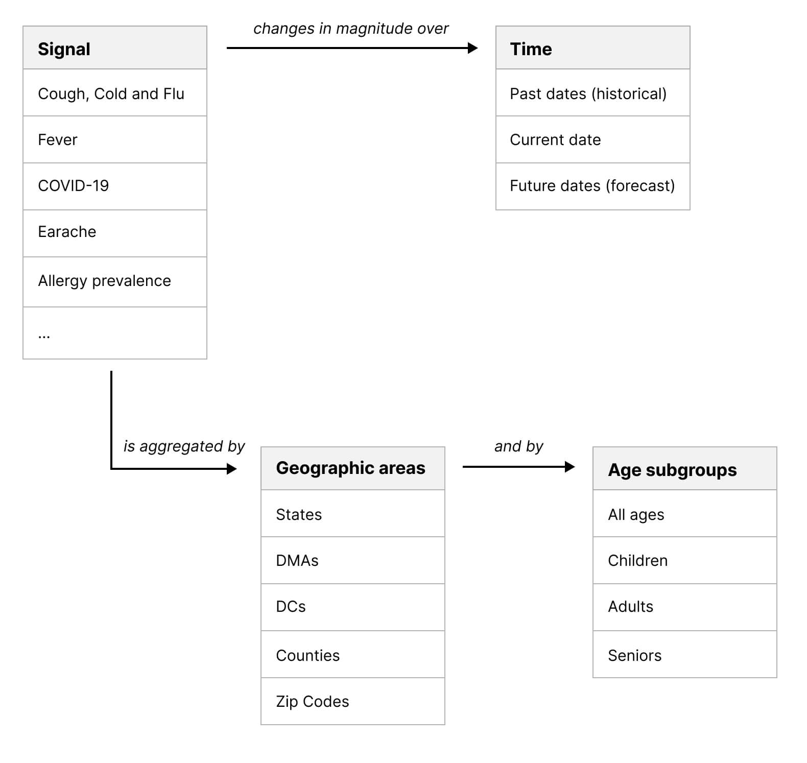 Laying it out this way enabled us to identify the most effective filters to be used in the UI to explore and visualize data from various angles. While the type of illness signals may evolve or be added over time, the principles remain constant. In short, illness levels fluctuate over time, and vary based on geography and age groups.
