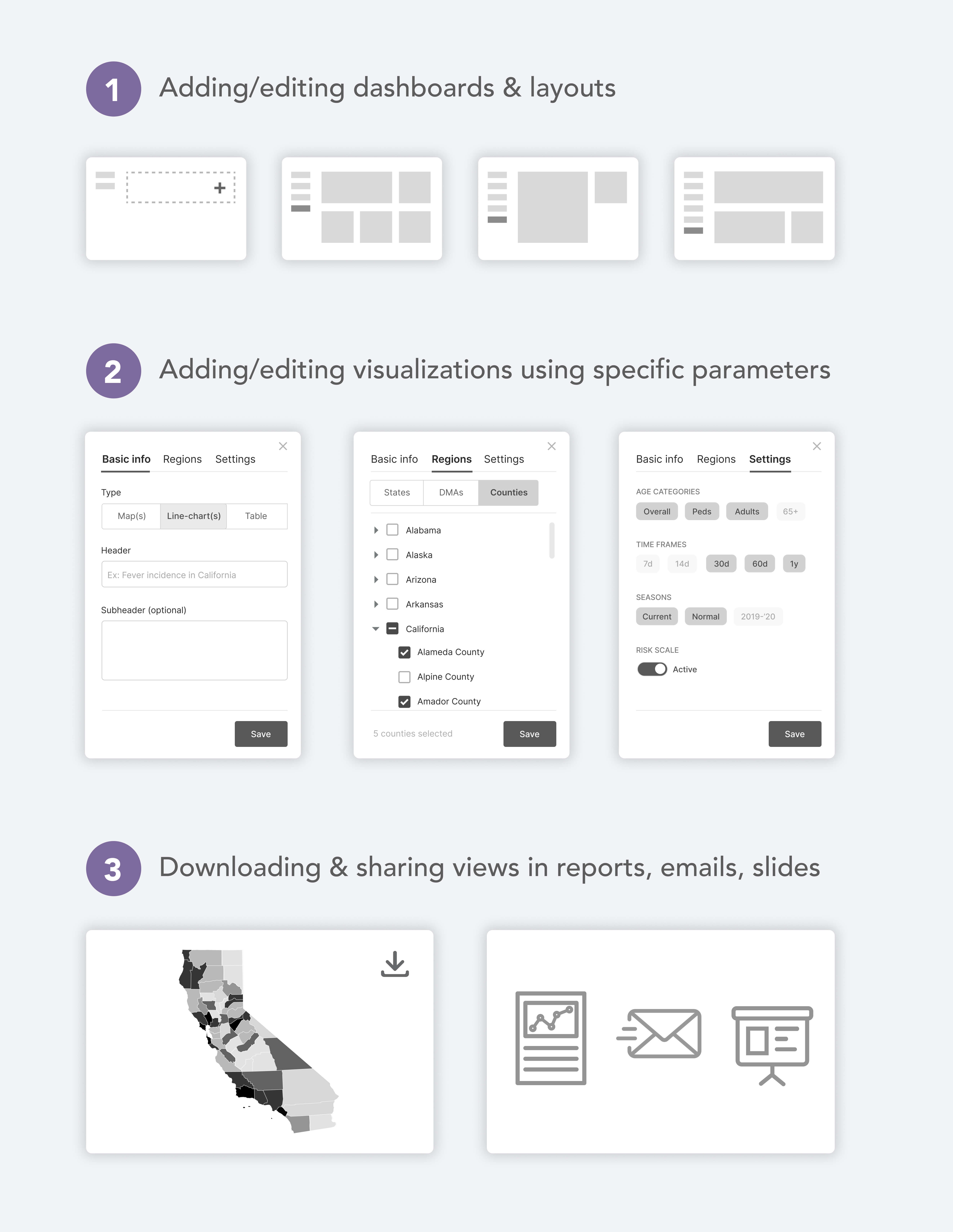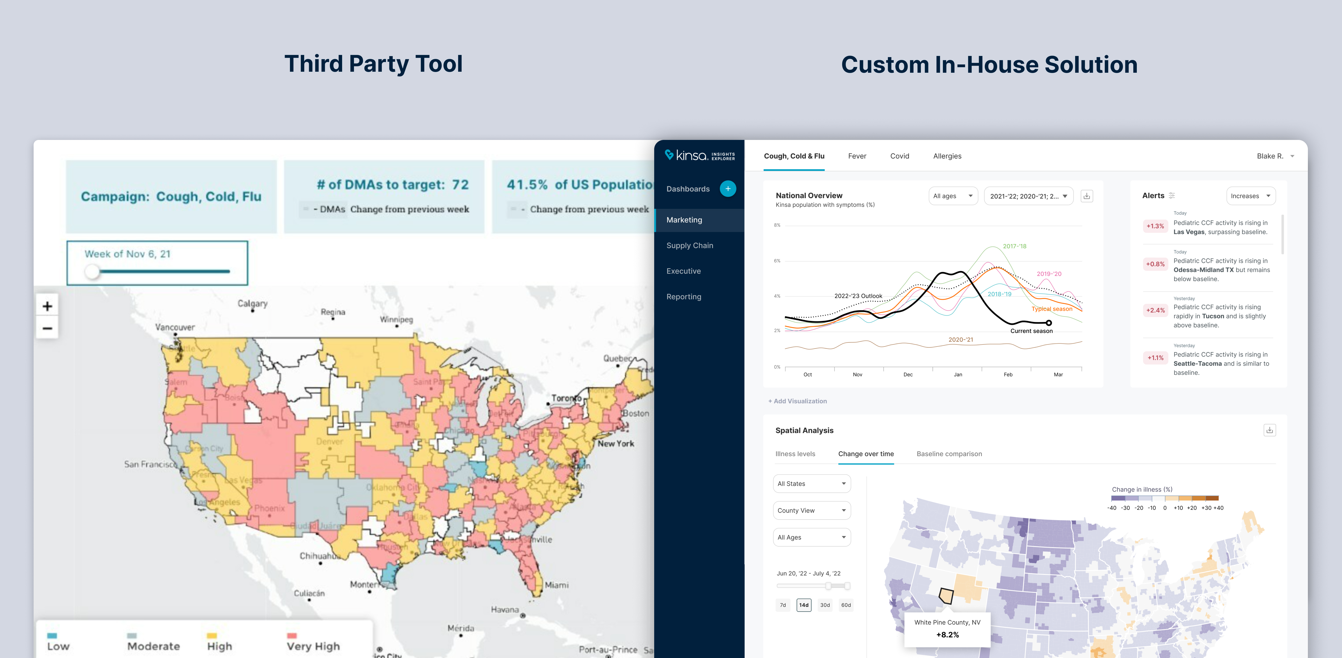 When I joined Kinsa, their analytics platform was relying on a third-party BI tool that failed to meet the business and user needs. It was slow, unstable, and didn't allow for much control over the UI. Additionally, we wanted to be able to automate beautiful charts for communication purposes. The process of collecting data from disconnected sources and manually visualizing data in silos was inefficient and wasted valuable employee time.