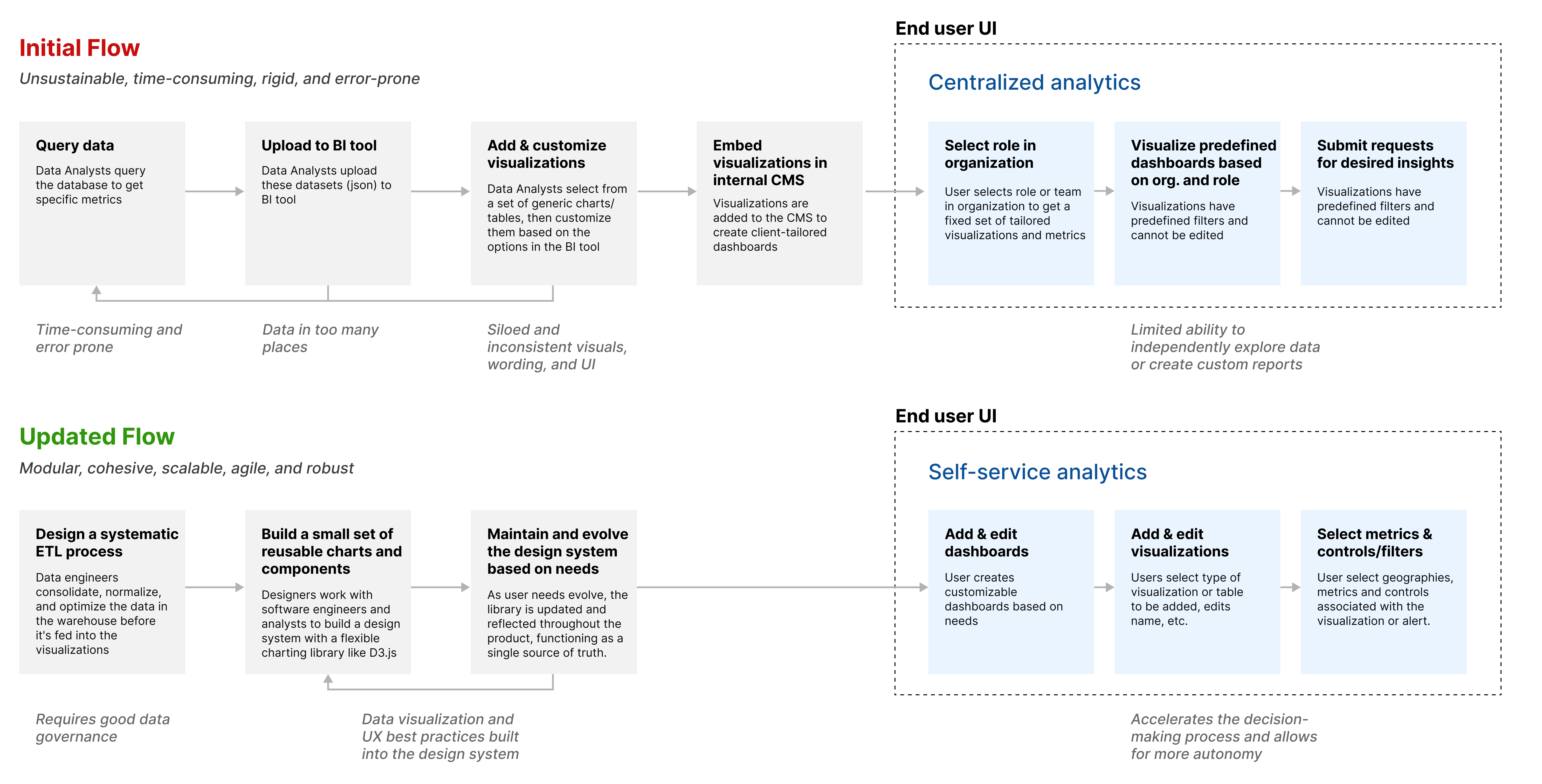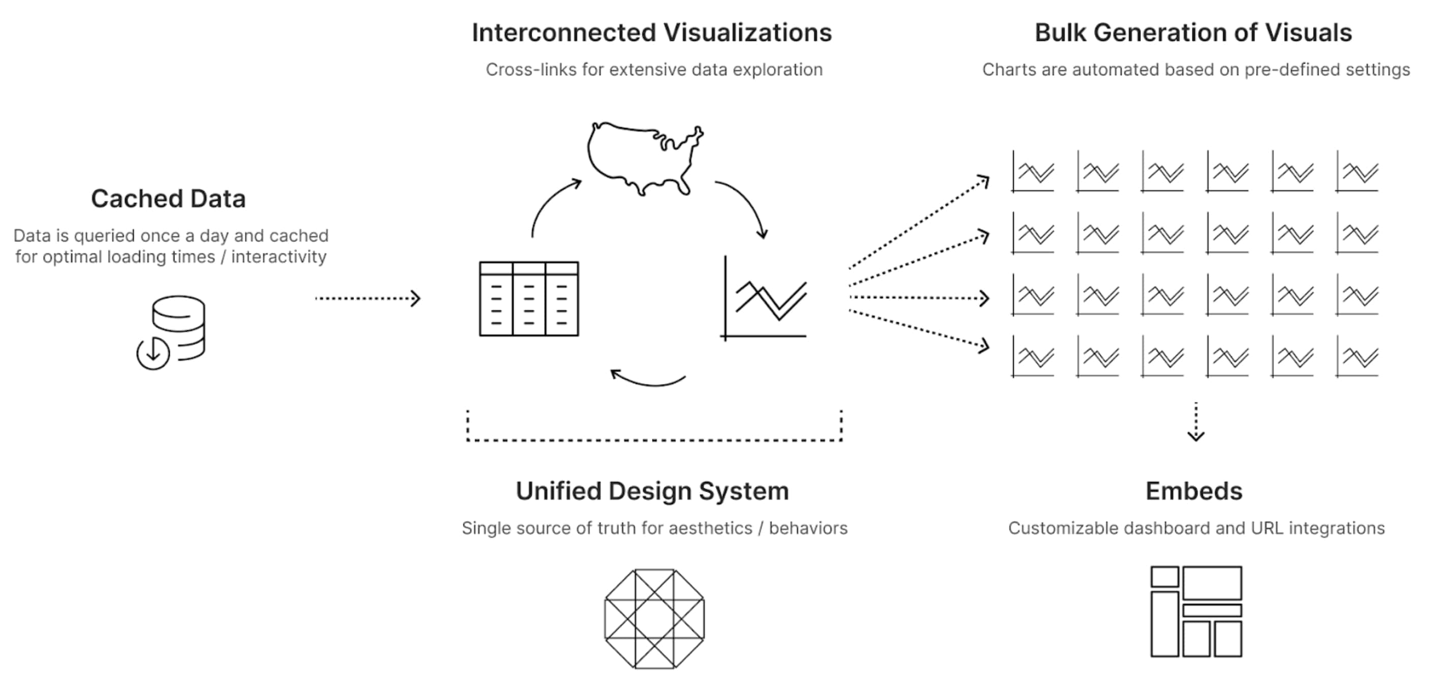 Prior to this, the visualizations created by our data analysts using a third-party tool were limited to subgroups of data and insights, with limited opportunities for exploration. Finding the common denominators helped us establish a simpler and more adaptable approach to creating the UI and visualizations.